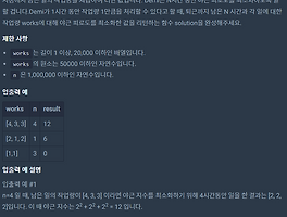 Study/Algorithm 썸네일형 리스트형 [백준][Op] AxB AxB 두 정수 A와 B를 입력받은 다음, A×B를 출력하는 프로그램을 작성하시오. 첫째 줄에 A와 B가 주어진다. (0 > a >> b; cout [백준][I/O] 그대로 출력하기2 그대로 출력하기2 입력이 주어진다. 입력은 최대 100줄로 이루어져 있고, 알파벳 소문자, 대문자, 공백, 숫자로만 이루어져 있다. 각 줄은 100글자를 넘지 않으며, 빈 줄이 주어질 수도 있고, 각 줄의 앞 뒤에 공백이 있을 수도 있다. 1234567891011#include #include using namespace std; int main(void){ string a; for(int i=0; i [백준][I/O] 그대로 출력하기 그대로 출력하기 입력이 주어진다. 입력은 최대 100줄로 이루어져 있고, 알파벳 소문자, 대문자, 공백, 숫자로만 이루어져 있다. 각 줄은 100글자를 넘지 않으며, 빈 줄은 주어지지 않는다. 또, 각 줄은 공백으로 시작하지 않고, 공백으로 끝나지 않는다. 1234567891011#include #include using namespace std; int main(void){ string a; for(int i=0; i [Level 3] 6. 줄 서는 방법 6. 줄 서는 방법 Algorithm - Level 3 - 풀이 1. 첫 번째 수는 n! / n 번씩 반복하여 오름차순으로 증가한다. -> 이를 이용하여 첫 번째 수를 answer에 삽입한다. 2. 두 번째 수는 첫 번째 수를 제외한 (n-1)! / (n-1) 씩 반복하여 오름차순으로 증가한다.-> 이를 이용하여 두 번째 수를 answer에 삽입한다 3. 이러한 과정을 반복하여 2개의 원소만 남았을 경우, 입력 k가 홀수 이면 순서대로, 입력 k가 짝수이면 역순으로 삽입한다. 1234567891011121314151617181920212223242526272829303132333435363738394041424344454647#include #include using namespace std; vecto.. [Level 3] 5. 야근 지수 알고리즘 5. 야근 지수 알고리즘 Algorithm - Level 3 - 풀이 1. 원소 중 최대값에 1을 빼는 행동을 n번 만큼 반복하면 된다. 1234567891011121314151617181920212223242526272829303132333435363738394041424344454647484950#include #include #include #include using namespace std; long long calculate(vector a){ long long answer = 0; for(int i=0; i0){ works[idx++]--; n--; } } } } return calculate(works);}Colored by Color Scriptercs 위 풀이 방법은 에서 말한 방법을 푼.. [Level 3] 4. 멀리 뛰기 4. 멀리 뛰기 Algorithm - Level 3 - 풀이 1. 점화식으로 보고 풀이하였다. 2. 1, 2 칸은 한 번에 갈 수 있다.-> 1 번째 인덱스는 경우의 수가 1, 2번째 인덱스는 경우의 수가 2이다. 5. i번째 인덱스는 i-1, i-2 의 합과 같다.-> 피보나치와 같다.123456789101112131415161718#include #include using namespace std; long long solution(int n) { long long answer = 0; vector dp(n, 0); dp[0] = 1; dp[1] = 2; for(int i=2; i [Level 3] 3. 거스름돈 경우의 수 3. 거스름돈 경우의 수 Algorithm - Level 3 - 풀이 1. 이 문제도 Dynamic Programming으로 접근가능하다. 2. n+1 크기의 배열을 선언한다. 3. 1부터 n까지 원소를 0으로 초기화한다.-> 만약, 화폐단위 중 1이 존재하면 모든 원소를 1로 초기화한다. 5. 화폐단위와 같은 거스름돈은 (n=5, money=5) 경우의 수를 1 증가한다. 6. 그 외는 n까지의 인덱스를 차례로 접근해 작은 화폐단위를 뺀 인덱스의 원소값을 더해준다.-> ex) money=2, index=5일 경우, 5-2=3 index에 위치한 원소값을 더해준다. 이는 그 전에 계산한 경우의 수를 더해주는 것으로 거스름돈이 5인 경우의 수는 money=2를 하나 선택하고 남은 돈 3의 경우의 수와 같다.. [Level 3] 2. Palindrome 2. Palindrome Algorithm - Level 3 - 풀이 1. palindrome은 문자열을 뒤집어도 같은 문자열을 의미한다. 2. 문자열의 어떤 문자를 잡았을 때, 그 문자와 대칭하는 문자를 우선 찾는다. 3. 대칭 되는 문자들을 기준으로 그 사이에 존재하는 문자들을 비교한다.-> 이 때, 하나라도 매칭되지 않는다면 기준 문자들은 올바르지 않은 매칭이다. 4. 효율성 : for문을 사용하되 기존의 매칭된 문자열의 길이보다 남은 문자열이 작다면 더 찾아봐도 그 길이 이상이 나올 수 없다. 1234567891011121314151617181920212223242526272829#include #include using namespace std; int solution(string s){ int.. 이전 1 2 3 4 다음